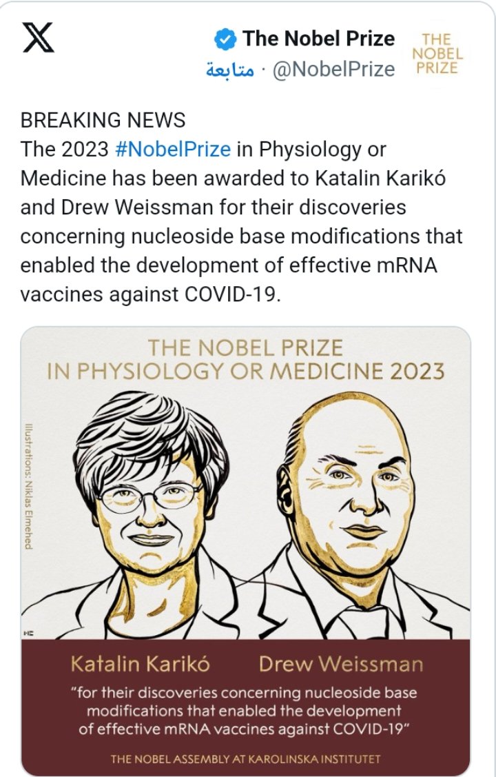 نيروز الإخبارية : منحت أكاديمية نوبل السويدية، اليوم الاثنين، جوائزها في الطب لعام 2023 لكل من الطبيب الأمريكي درو وايزمان وعالمة الكيمياء الحيوية المجرية كاتالين كاريكو، وذلك تقديرًا لعملهما البحثي في مجال لقاح الحمض النووي الريبوزي المرسال المضاد لوباء كورونا.