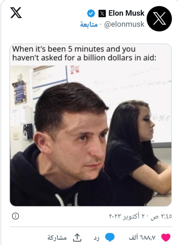 نشر مالك موقع "إكس" (تويتر سابقًا) صورة معدلة لوجه زيلينسكي وهو في حالة غضب، مكتوب عليها "عندما تمر 5 دقائق وأنت لم تطلب مساعدة بمليار دولار".
