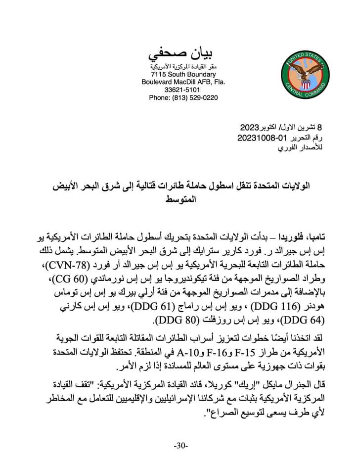 أمر البنتاغون المجموعة الهجومية لحاملة الطائرات "جيرالد آر. فورد" بالإبحار إلى شرق البحر الأبيض المتوسط لتكون جاهزة لمساعدة إسرائيل.