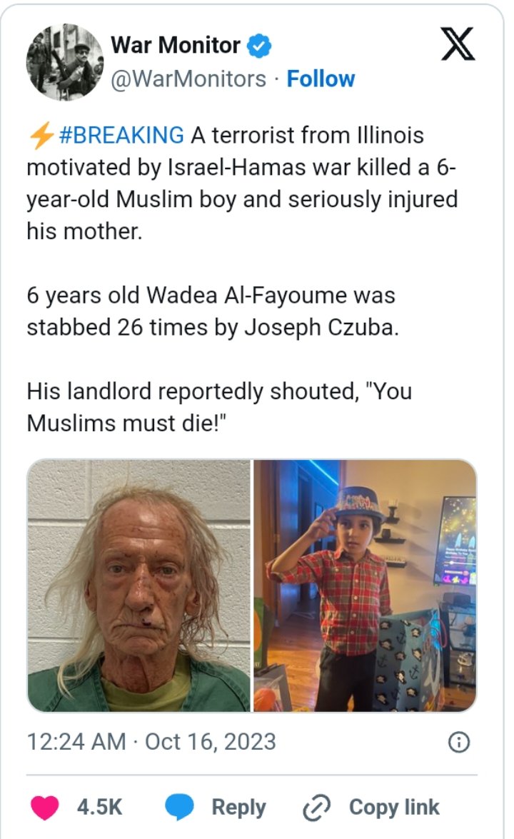 وقالت شرطة الولاية؛ إن القاتل البالغ من العمر 71 عاما، يشتبه أنه ارتكب جريمة الكراهية ضد الطفل ذي الأصول الفلسطينية، بسبب الحرب الدائرة في فلسطين، والعدوان الإسرائيلي على قطاع غزة.