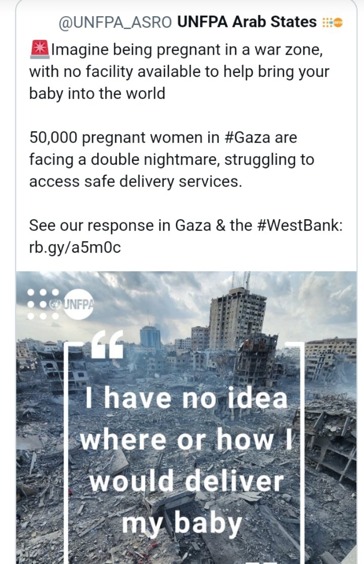 مضيفا: "تخيلي أنك حامل في منطقة حرب، مع عدم وجود أي وسيلة متاحة للمساعدة في إنجاب طفلك إلى العالم. في غزة، تواجه 50 ألف امرأة حامل كابوسا مزدوجا، حيث الرعب الناجم من الحرب والكفاح من أجل الوصول إلى خدمات الولادة الآمنة".