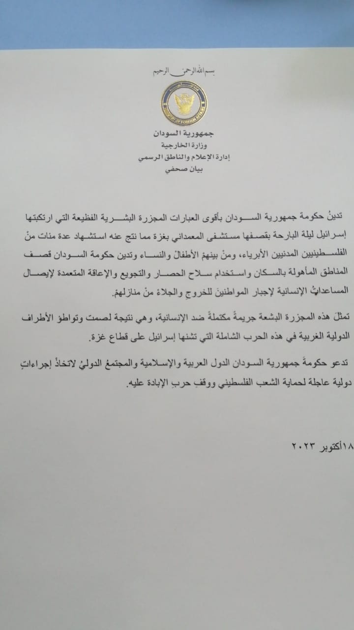 ادانت  حكومة جمهورية السـودان  وفق بيان أصدرته  وصل نسخة منه لموقع "نيروز الإخباري " بأقوى العبارات المجزرة البشـرية الفظيعة التي ارتكبتها إسرائيل ليلة البارحة بقصفها مستشفى المعمداني بغزة مما نتج عنه استشهاد عدة مئات من الفلسطينيين المدنيين الأبرياء، ومن بينهم الأطفال والنسـاء وتدين حكومة السـودان قصـف المناطق المأهولة بالسكان واستخدام سـلاح الحصـار والتجويع والإعاقة المتعمدة لإيصـال المساعدات الإنسانية لإجبار المواطنين للخروج والجلاء من منازلهم.