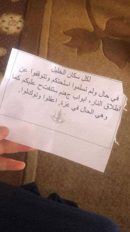ألقى الجيش الاسرائيلي منشورات في الخليل، يُطالب فيها السكّان التوقف عن إطلاق النار، مهدّداً بـ"فتح باب جهنم" عليهم، وقال لهم: "اعقلوا وتوكّلوا".