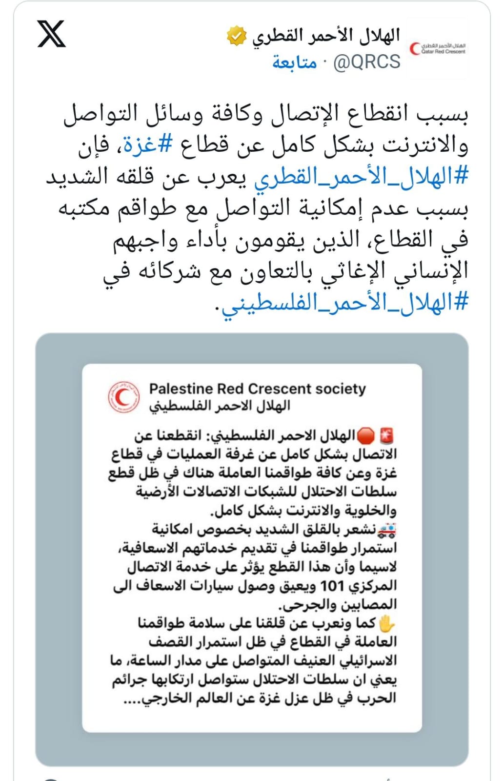 أعرب الهلال الأحمر القطري عن قلقه على سلامة طواقمه العاملة في قطاع غزة، مع ارتفاع شدة قصف الاحتلال الإسرائيلي، معلناً انقطاع تواصله مع طواقمه نتيجة قطع الاتصالات بشكل كامل.