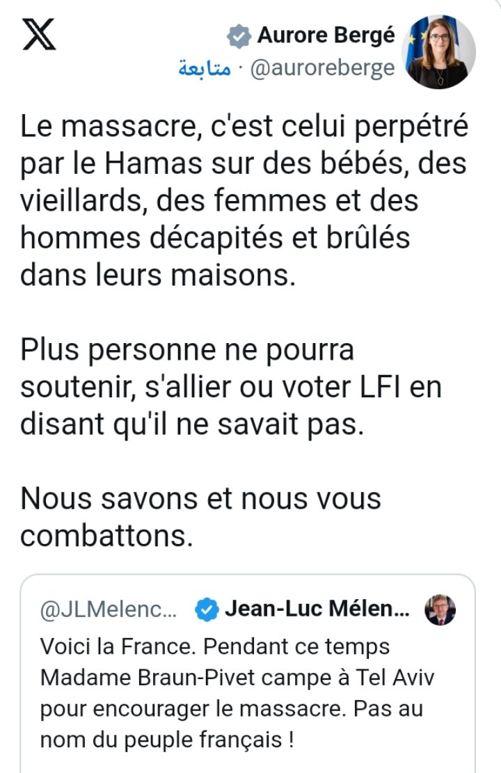 اضطرت وزيرة التضامن والأسرة الفرنسية، أورور بيرجيه، إلى حذف منشور على حسابها بمنصة "إكس" تبنت فيها رواية إسرائيلية عن قصة مزعومة "تتحدث عن ذبح حماس طفلا" بالرغم من تكذيب هذه الرواية.