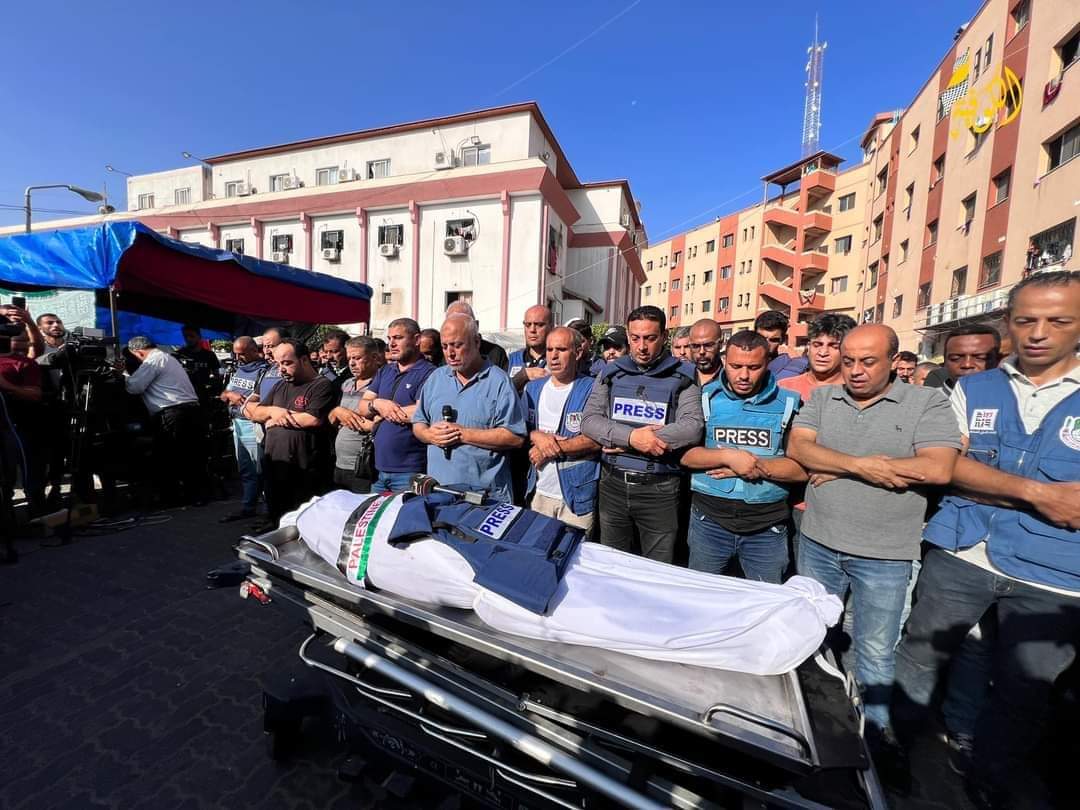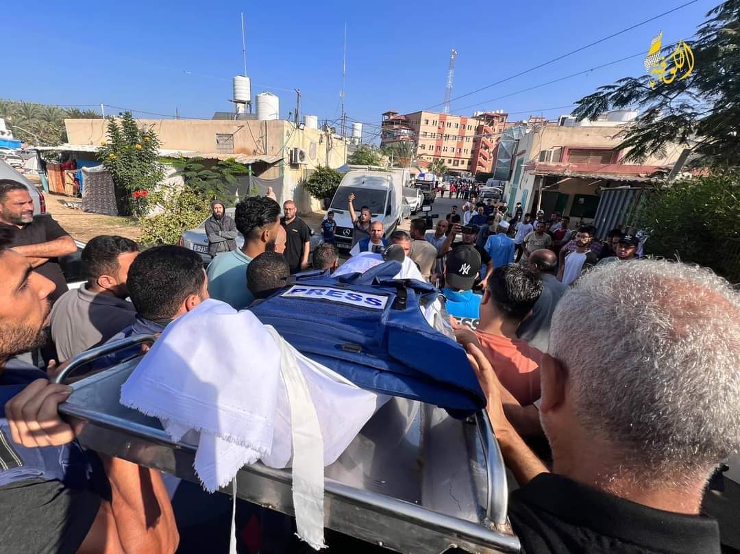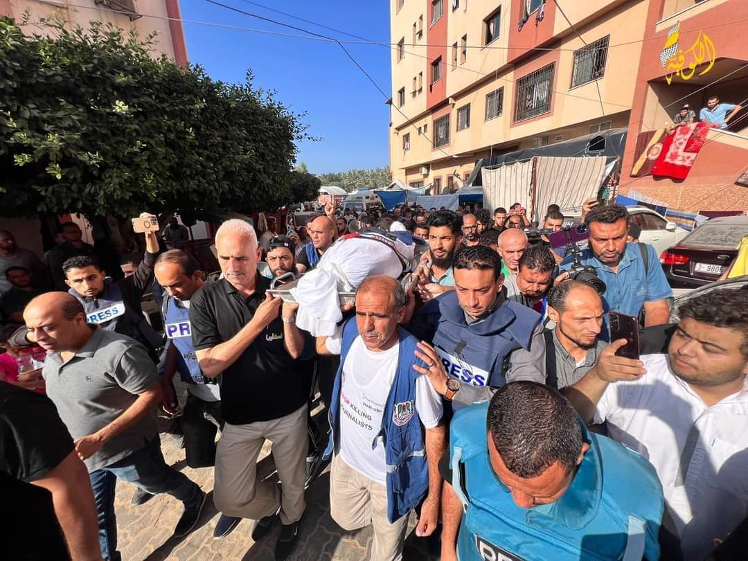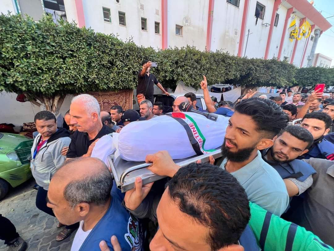 شيع مجموعة من الصحفيين، صباح اليوم الجمعة، جثمان الزميل الصحفي، مراسل تلفزيون فلسطين، الشهيد محمد أبو حطب، وعدد من أفراد عائلته، في خان يونس، جنوب قطاع غزة.