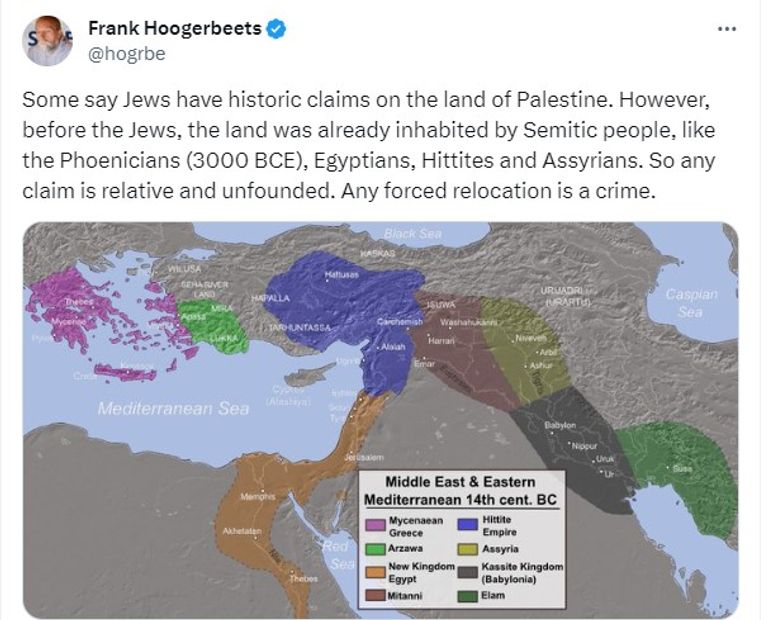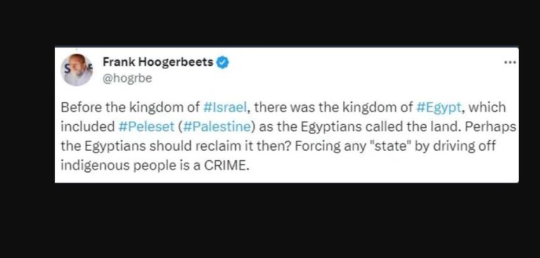 وتطرق العالم الهولندي، في تغريداته، إلى تسمية "فلسطين" وكيف نشأت قبل قيام دولة إسرائيل بسنوات طويلة جدا تعود إلى مئات السنين قبل الميلاد، بل وكونها عاصرت دولة المصريين القدماء وكانت ضمن مملكتهم.