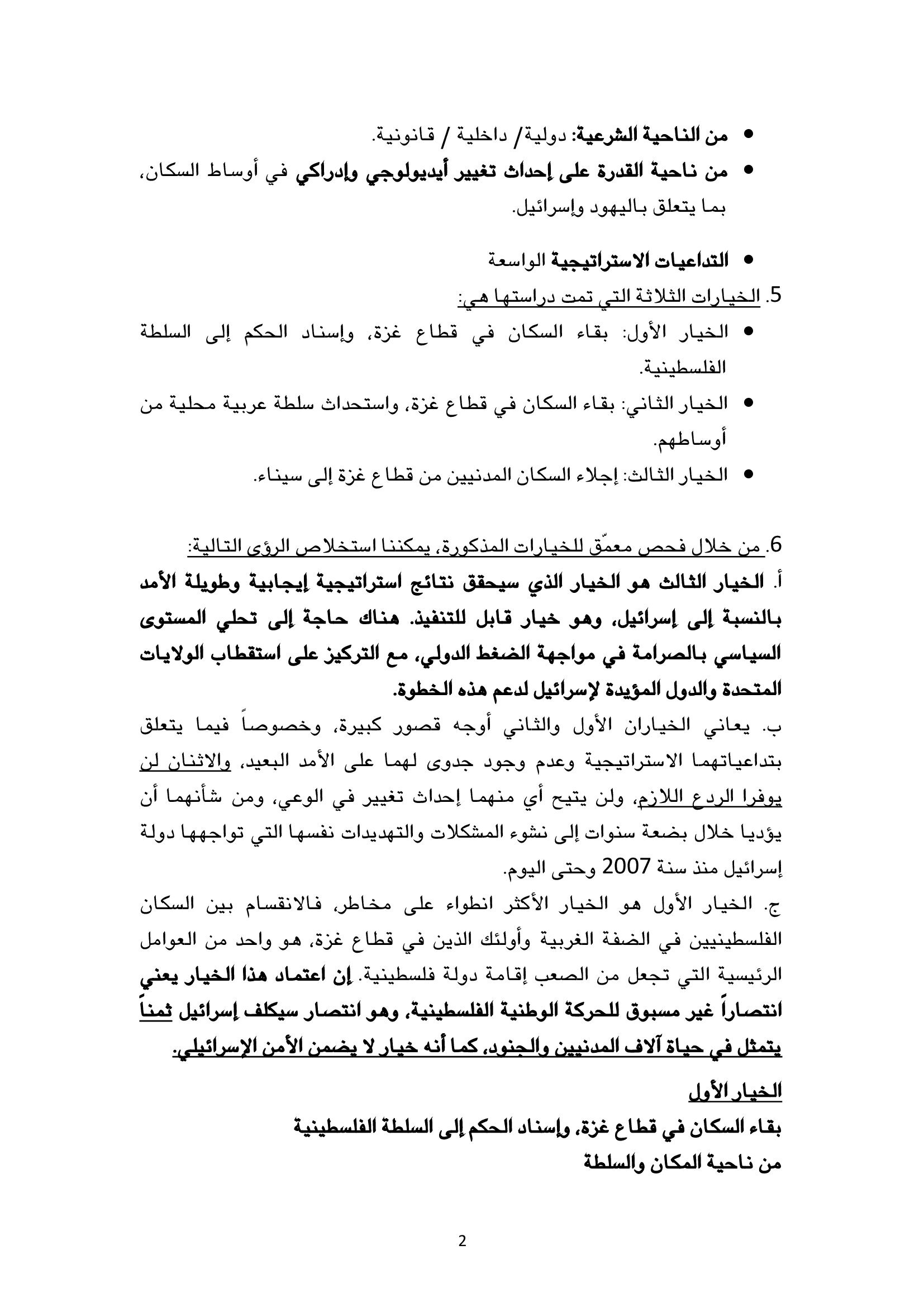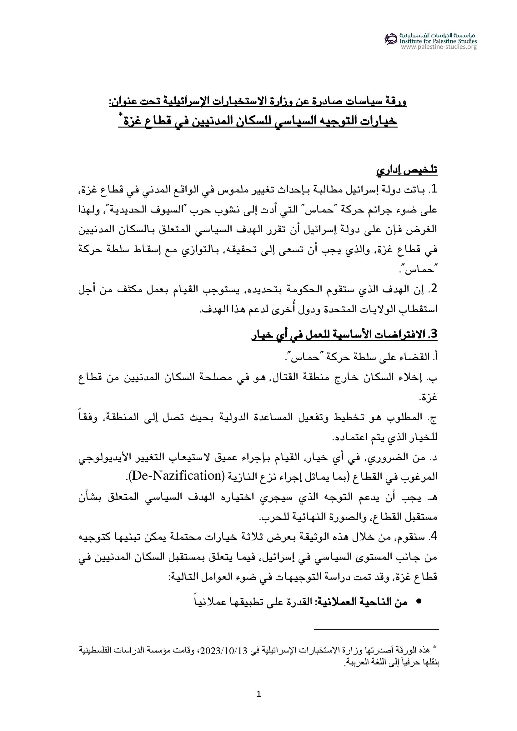 نشرت مؤسسة الدراسات الفلسطينية وثيقة أصدرتها وزارة الاستخبارات الاسرائيلية بتاريخ 13/10/2023.