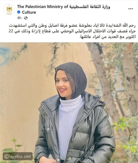 انضمت الفنانة الفلسطينية تالا إياد بعلوشة، عضو فرقة أصايل الوطن إلى قائمة الفنانين الذين استشهدوا جراء القصف على قطاع غزة والذي بدأ في 7 أكتوبر الماضي، ومستمر حتى الآن.