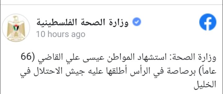 وفي وقت سابق اليوم، أعلنت الوزارة استشهاد مواطن برصاصة في الرأس أطلقها عليه جيش الاحتلال في مدينة الخليل جنوبي الضفة الغربية.