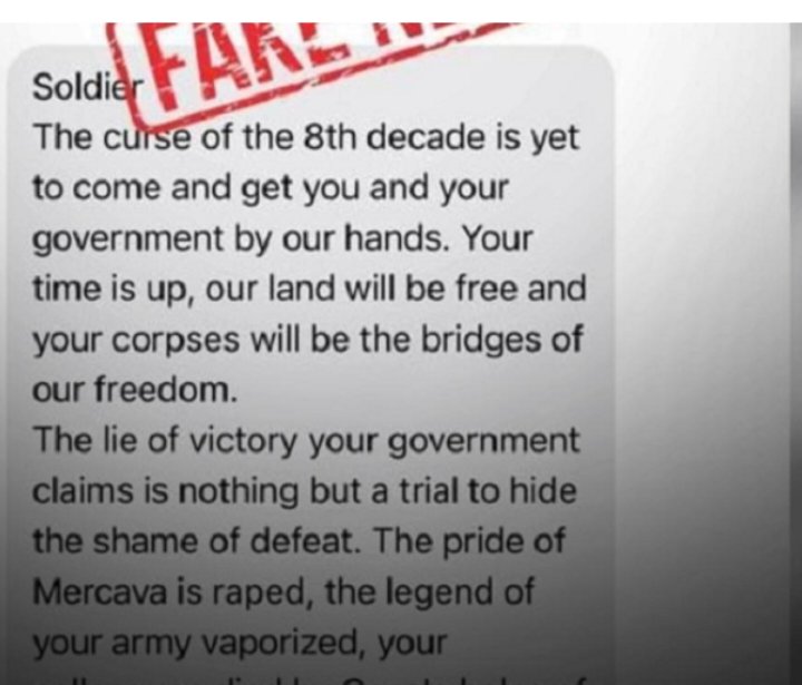 وتقول الرسالة "لعنة العقد الثامن قادمة إليكم وستنال منكم ومن حكومتكم من خلالنا.. حان وقت القضاء عليكم.. أرضنا الفلسطينية ستكون حرة وجثثكم ستكون الجسر الذي نمر عليه نحو حريتنا.. الكذبة التي تدعيها حكومتكم بالانتصار هي مجرد طريقة لإخفاء هزيمتهم".