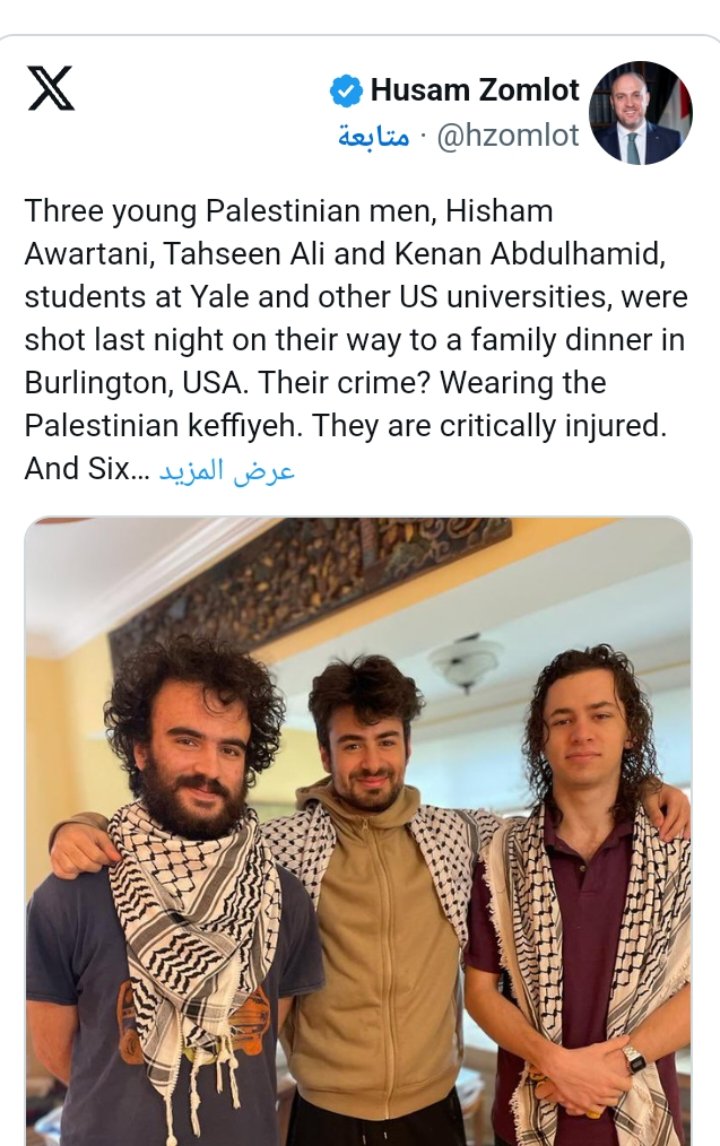 وكتب حسام زملط على حسابه الرسمي بموقع "إكس" (تويتر سابقا) أن ثلاثة شبان فلسطينيين هم: هشام عورتاني، وتحسين علي، وكنان عبد الحميد يدرسون في جامعة ييل وغيرها من الجامعات الأميركية.