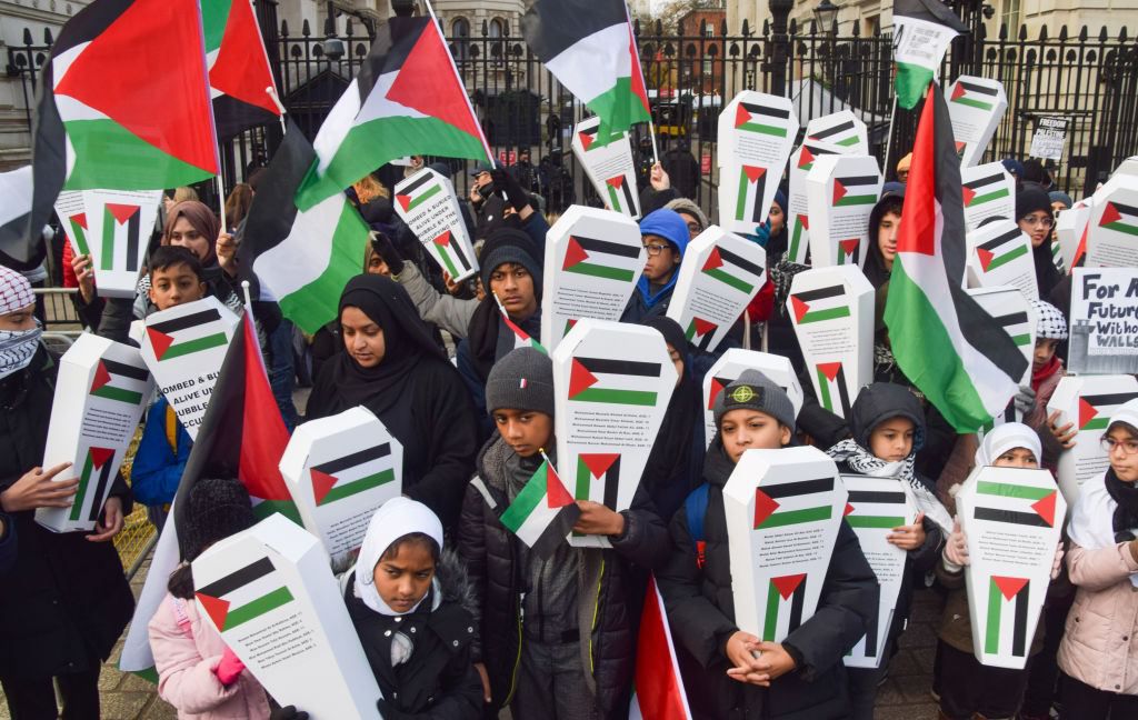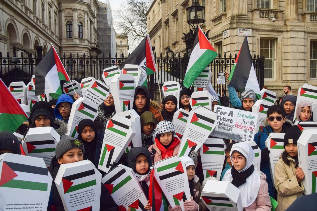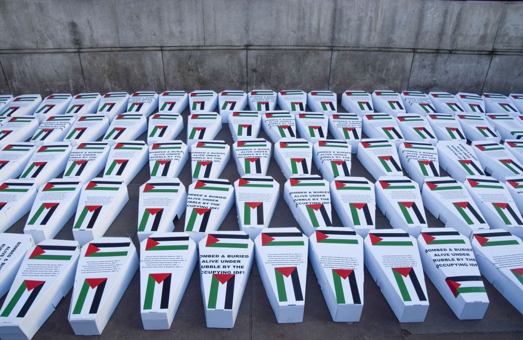 توابيت صغيرة تعبّر عن أكثر من 6 آلاف طفل فلسطيني قتلتهم "إسرائيل" في قطاع غزة، وضعها متظاهرون في العاصمة البريطانية لندن، خلال تظاهرة مطالبة بوقف دائم لإطلاق النار...