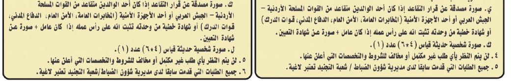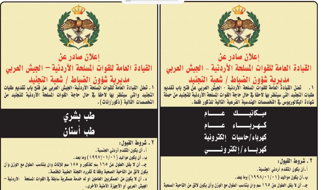 أعلنت القوات المسلحة الأردنية، اليوم الأحد، عن فتح باب التجنيد لحملة شهادة البكالوريوس في التخصصات المعلنة أدناه.