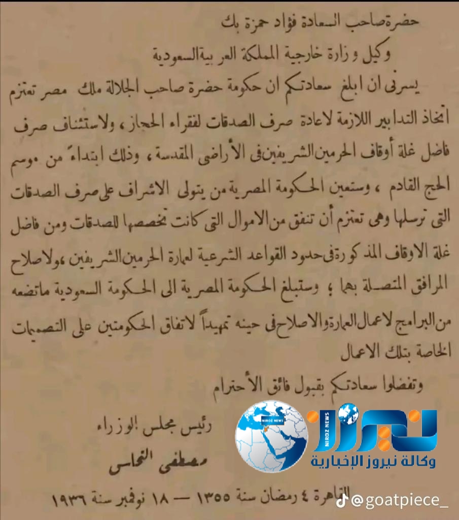 فقد حصلت ( نيروز ) على وثيقة نادرة موجهة من مصطفى النحاس رئيس مجلس الوزراء المصري الى وكيل وزارة خارجية السعودية آنذاك وتاريخ الوثيقة يعود لشهر نوفمبر