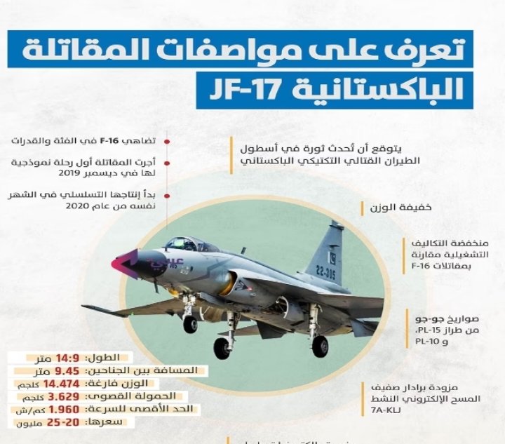 وفيما يلي إنفوغراف بمواصفات المقاتلة الباكستانية "JF-17":