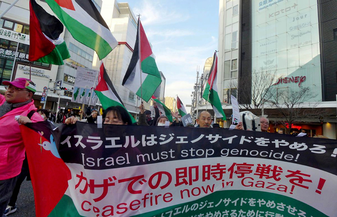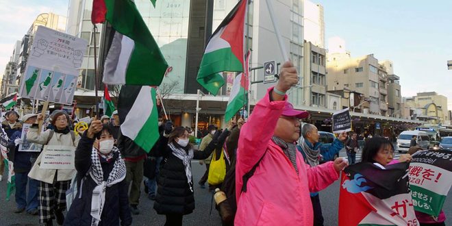 كما شارك مئات اليابانيين المتضامنين مع فلسطين اليوم في وقفة احتجاجية أمام السفارة الأمريكية في منطقة أكاساكا في العاصمة طوكيو.