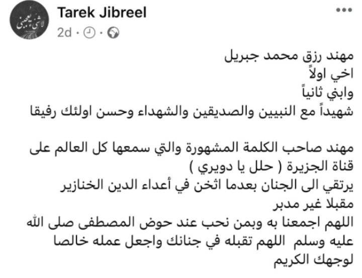 المنشور جاء على لسان طارق جبريل، الذي أعلن خبر استشهاد أخيه مهند.