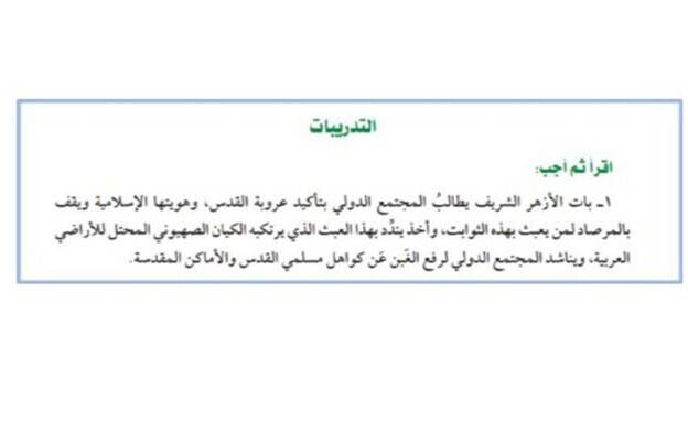 وأضافت: "في كتاب الأزهر يتعلم الطلاب أن على المجتمع الدولي أن يعترف بالهوية العربية للقدس، التي هي عاصمة فلسطين الأبدية، وتتجاهل المادة الدراسية أي صلة إسرائيلية أو يهودية بها، ويتعلمون أيضًا أن جميع المسلمين ملزمون بحماية القدس من الكيان الصهيوني الغازي".