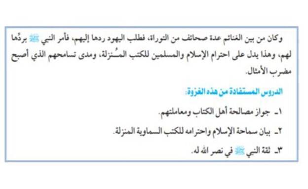 وأضافت: "تعكس كتب الأزهر المدرسية صراع المسلمين مع يهود خيبر في بداية العصر الإسلامي، حيث كانت هناك معاهدة يقومون حينها بحماية المسلمين من شر يهود بني قنيقعة وبني النضير وبني قريظة الذين تم ترحيلهم من المدينة المنورة إلى خيبر ولكنهم خططوا لإيذاء المسلمين ونقضوا المعاهدة". وقالت الدراسة: المناهج الأزهرية تعلم الطلاب أن يهود المدينة (في زمن النبي محمد - صلى الله عليه وسلم - في بداية الإسلام) نقضوا عهدهم مع المسلمين، مما كشف عن طبيعتهم الغادرة، وأن الخيانة هي طبيعة اليهود، التي لا يستطيعونها التخلي عنها".