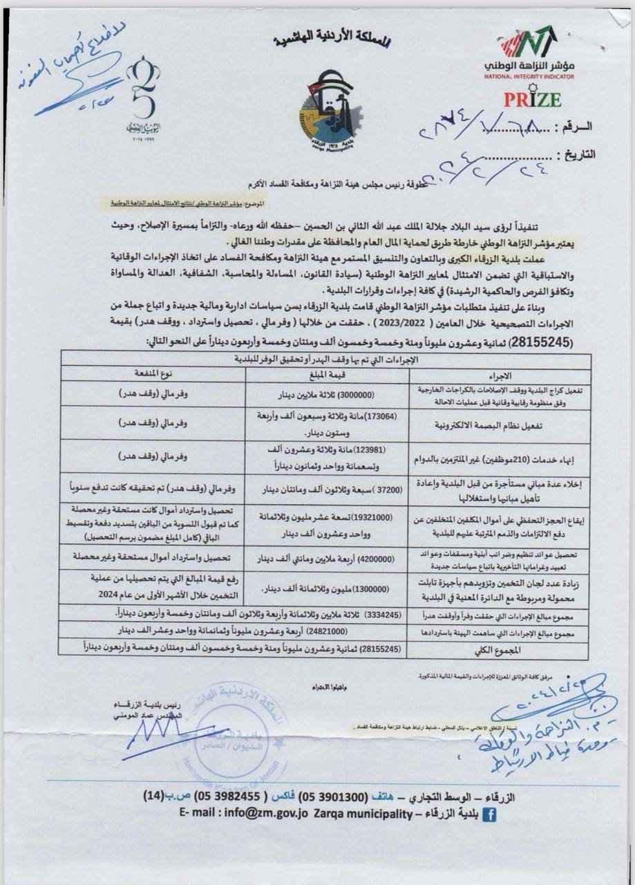 تلقت هيئة النزاهة ومكافحة الفساد كتابًا من بلدية الزرقاء يفيد أنها وبالتعاون والتنسيق المستمر مع الهيئة لاتخاذ إجراءات رقابية واستباقية وامتثالًا لمعايير النزاهة الوطنية إضافة إلى إجراءات تصحيحية خلال العامين 2022/2023 حققت من خلالها وفرًا ماليًا وحصلت واستردت ما قيمته 28 مليونًا و 155 ألف دينار .