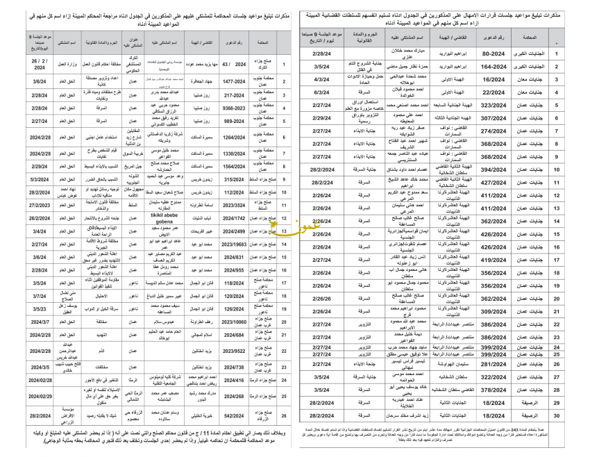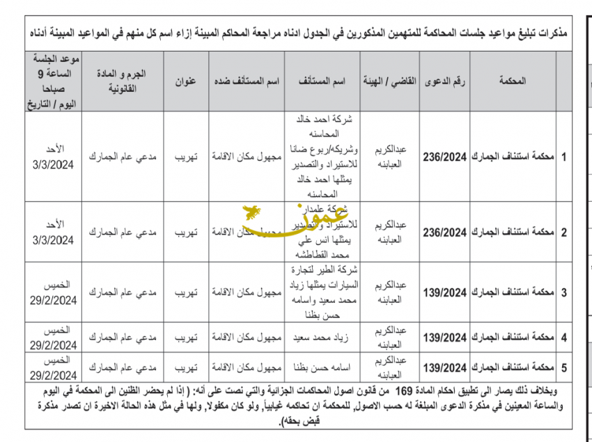 وفي مذكرات أخرى، طالبت محاكم متهمين مراجعة المحاكم المبينة إزاء اسم كل منهم في المواعيد المبينة.