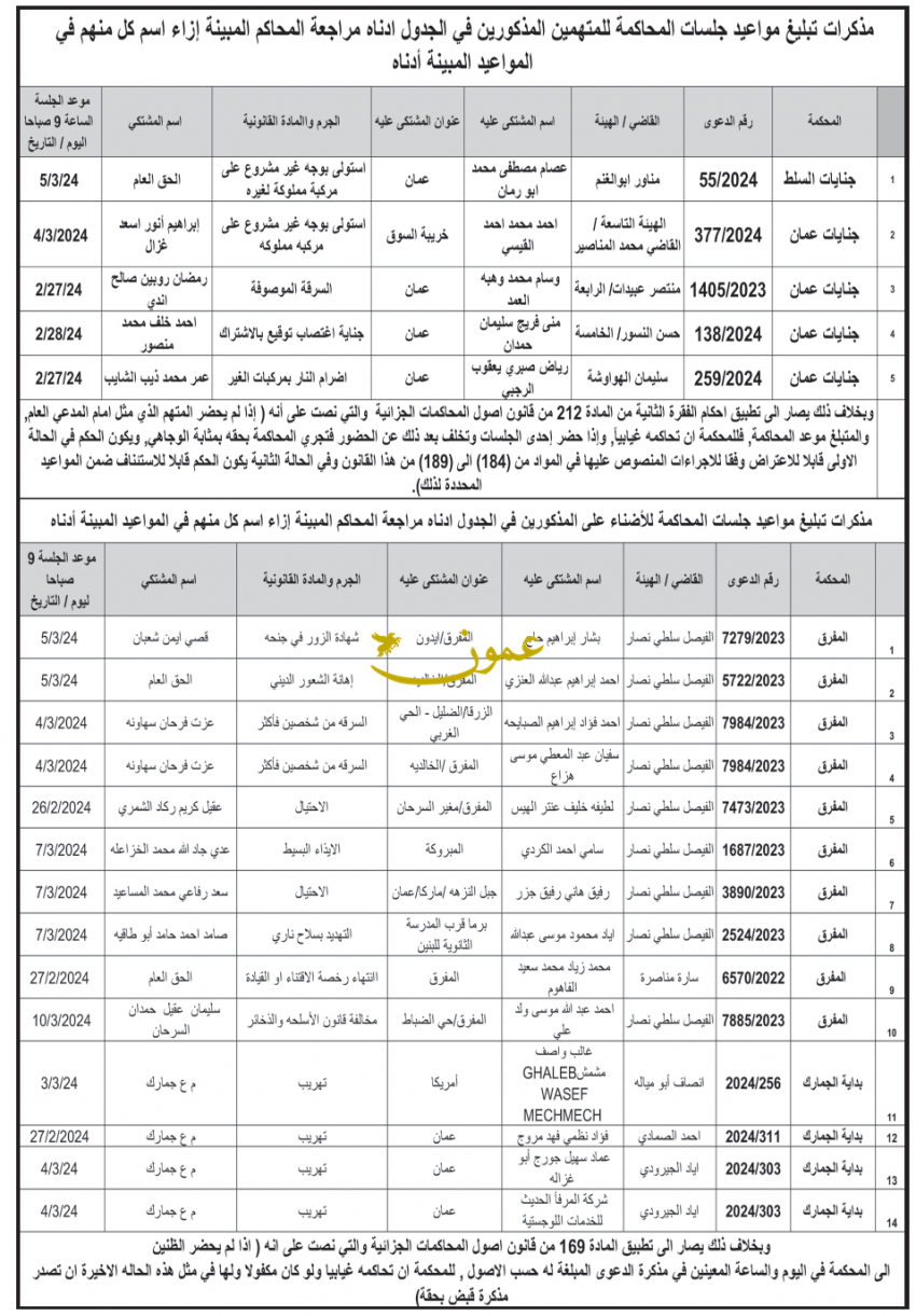 ونشرت المحاكم، أسماء المتهمين، عملا بأحكام المادة 243 من قانون أصول المحاكمات الجزائية.