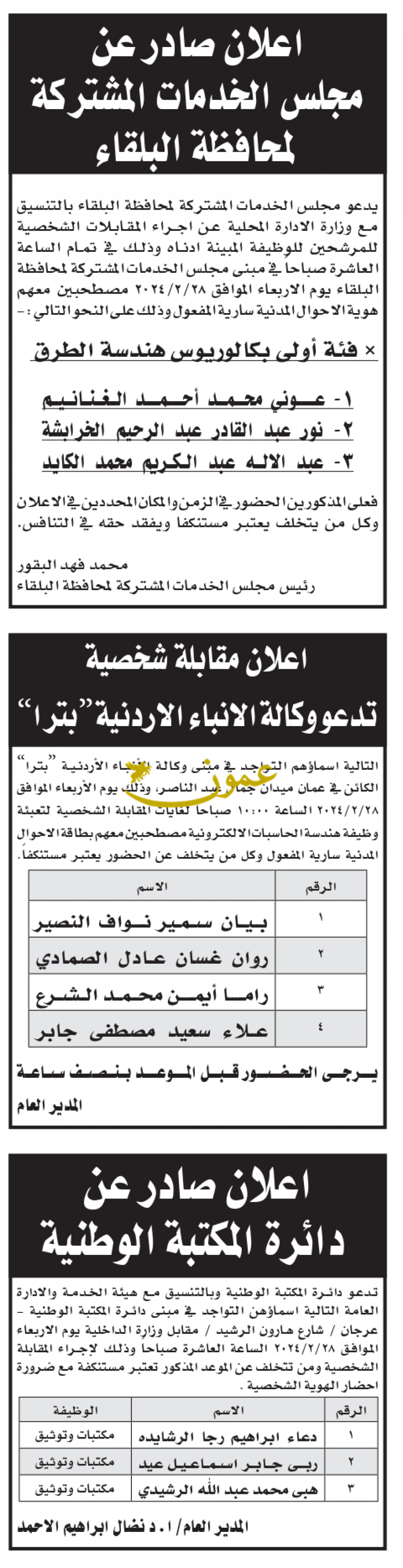 كما دعت مجموعة من المرشحين لإجراء المقابلات الشخصية وحضور الامتحان التنافسي واستكمال إجراءات التعيين.