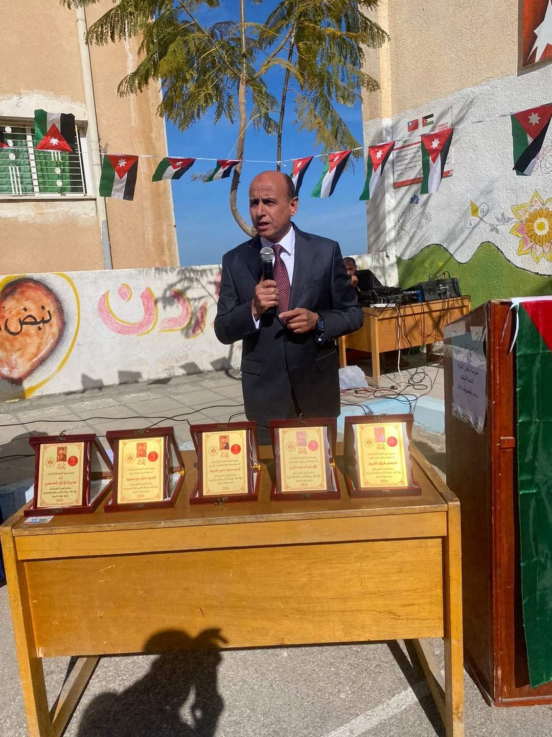 وعبر مدير التربية أسعد الشرع عن اعتزاز الأسرة التربوية في المحافظة بالأعياد والمناسبات الوطنية ،مشيدا بجهود جلالة الملك عبدالله الثاني وسمو الأمير الحسين بن عبدالله الثاني، ولي العهد وسعيهم الدائم لرفعة وازدهار الأردن ودوره الواضح في مساعدة الأهل في غزة لوقف الحرب.