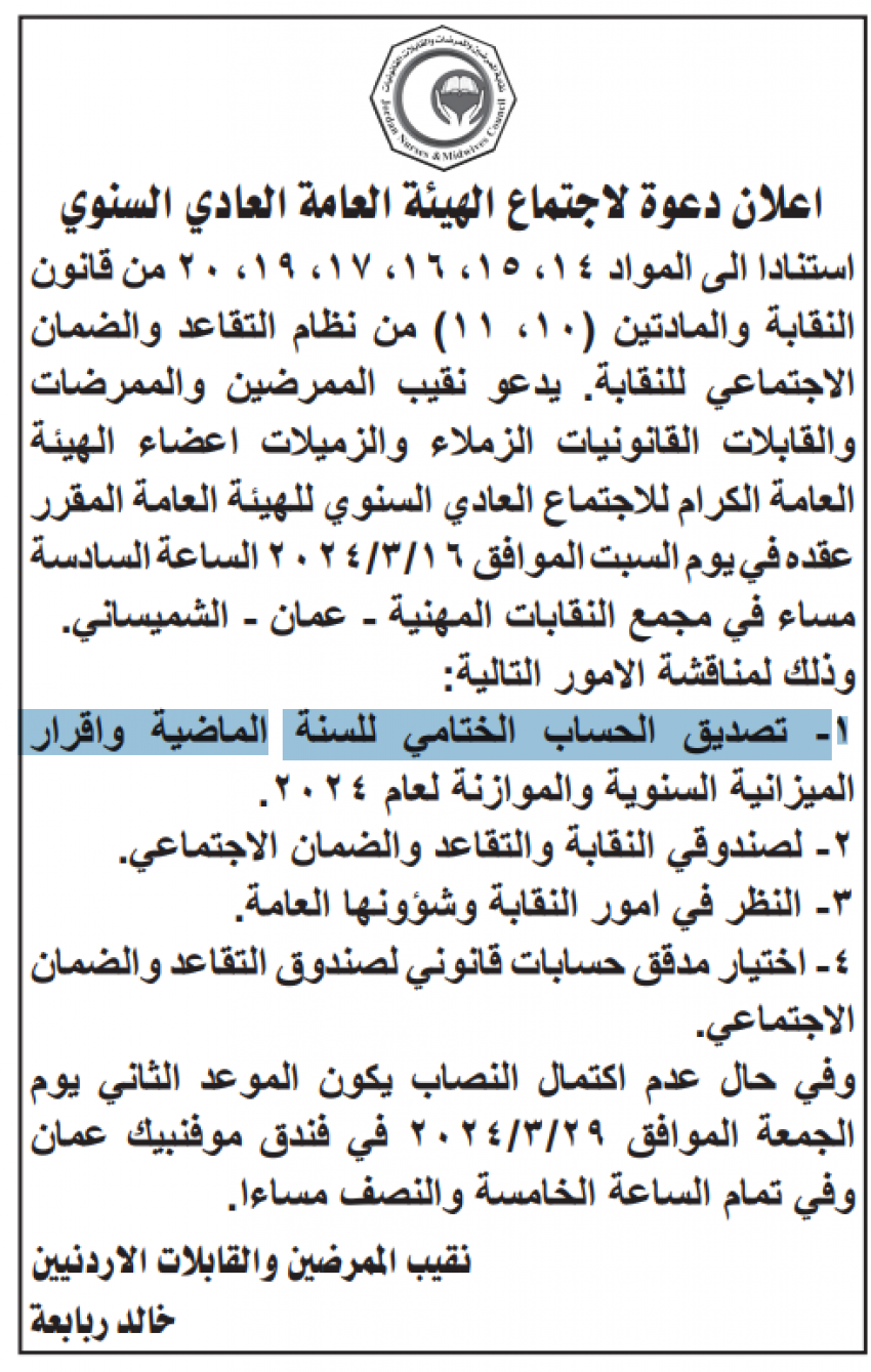 دعت نقابة الممرضين والقابلات الأردنيين، منتسبيها لحضور الاجتماع العادي السنوي للهيئة العامة المقرر عقده يوم السبت 16 آذار.