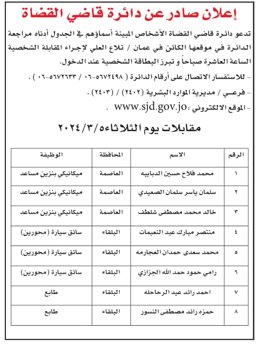 دائرة قاضي القضاة تدعو مرشحين للتعيين لإجراء مقابلة شخصية ...اسماء