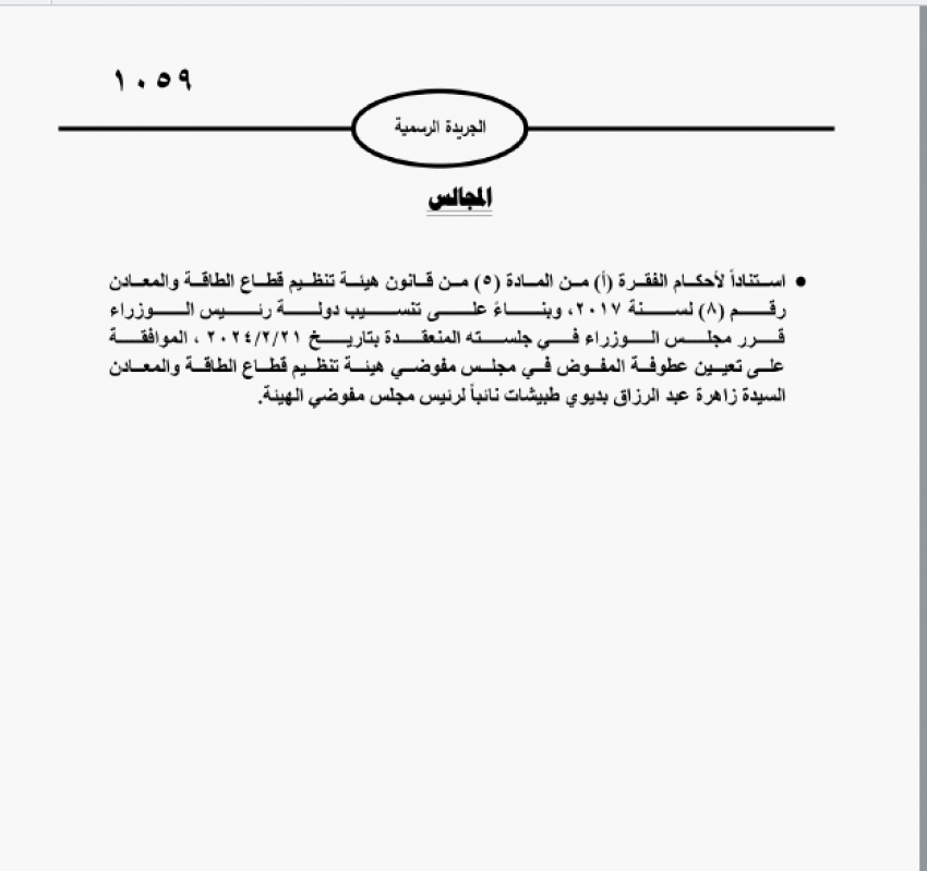 صدر في عدد الجريدة الرسمية اليوم الخميس، قرار مجلس الوزراء،المتعلق بتعيين زاهرة عبد الرزاق بديوي الطبيشات، نائبًا لرئيس مجلس مفوضي هيئة تنظيم الطاقة والمعادن.
