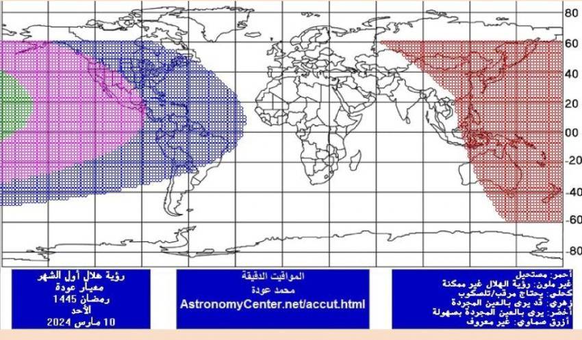 وأفاد مركز الفلك الدولي في بيان إلى امكانية رؤية الهلال يوم الاثنين الموافق 11-3 بالعين المجردة في معظم الدول، مؤكدا في الوقت نفسه عدم امكانية رؤيته يوم الاحد الموافق 10 -3 حتى بالتلسكوب.