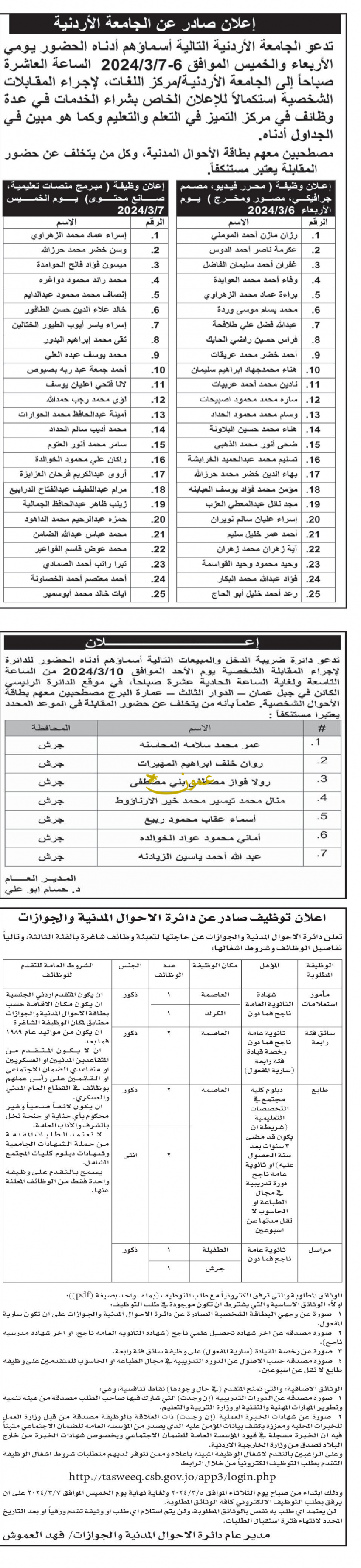 كما دعت عددا من المرشحين لإجراء المقابلات الشخصية وحضور الامتحان التنافسي واستكمال إجراءات التعيين.
