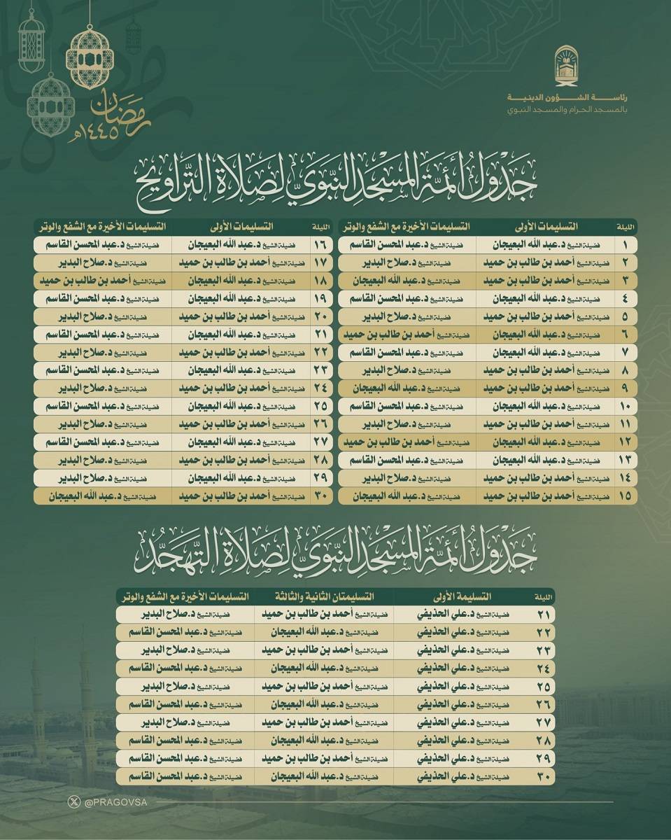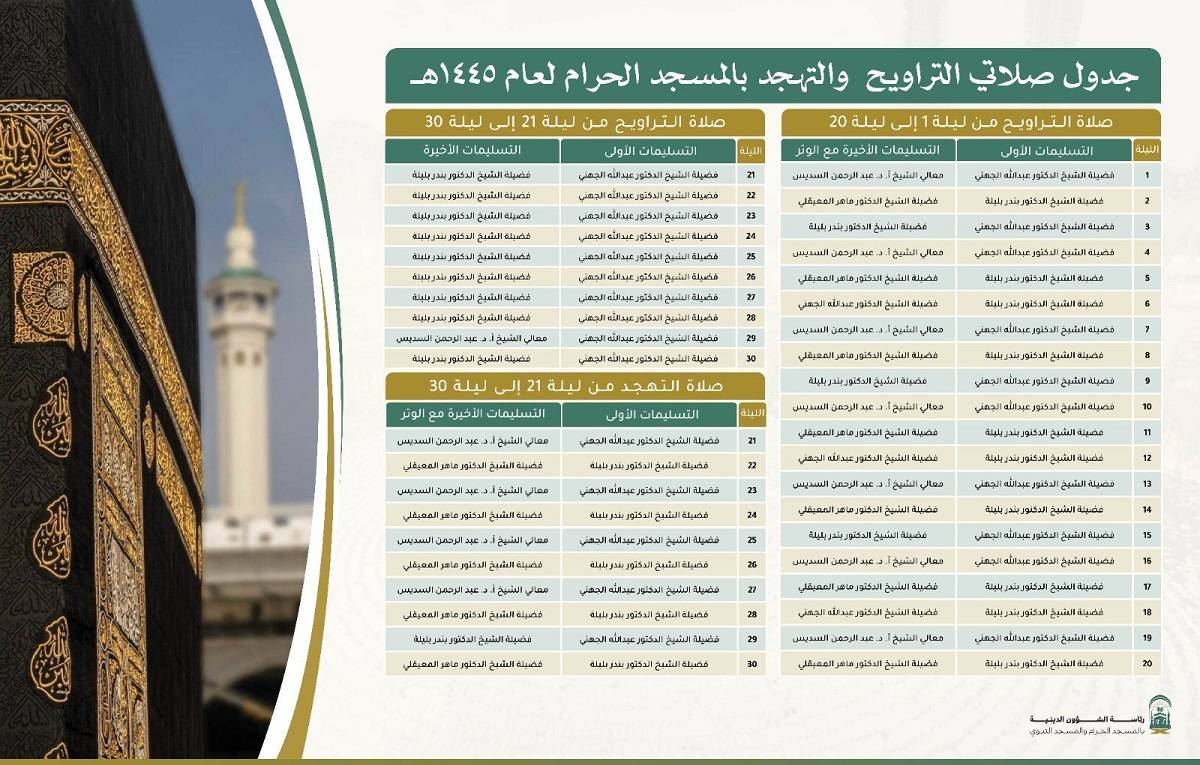 جدول الأئمة في صلاتي التراويح والتهجد بالحرمين الشريفين خلال شهر رمضان المبارك :