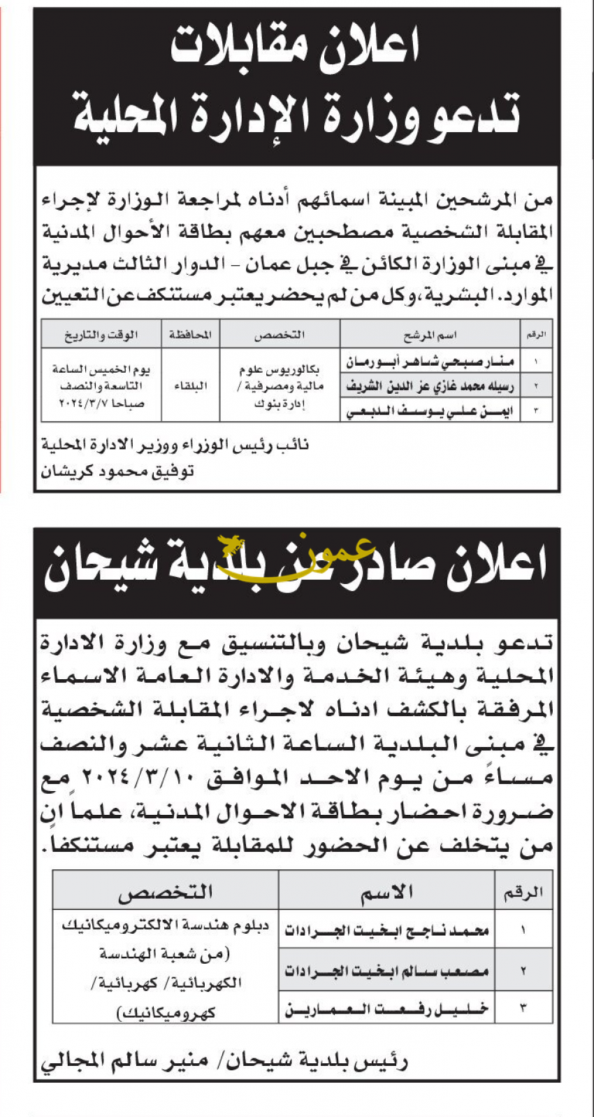 كما دعت عددا من المرشحين لإجراء المقابلات الشخصية وحضور الامتحان التنافسي واستكمال إجراءات التعيين.