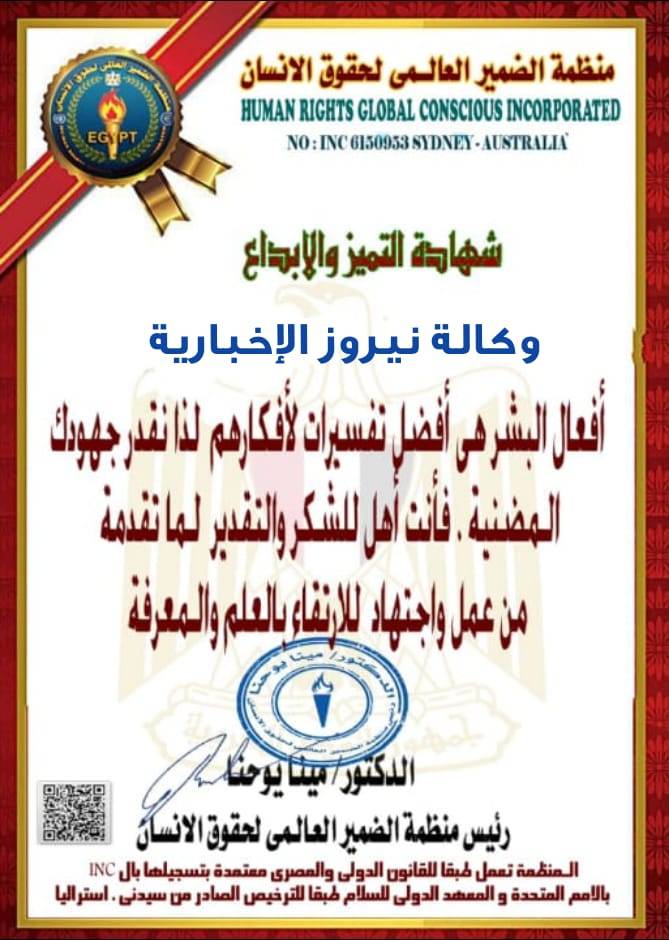 خاص نيروز الإخبارية: حصلت وكالة نيروز الإخبارية على شهادة التميز والإبداع من منظمة الضمير العالمي لحقوق الإنسان،وذلك تكريمآ وشكرآ لما تقدمه من عمل واجتهاد للارتقاء بالعلم والمعرفة.