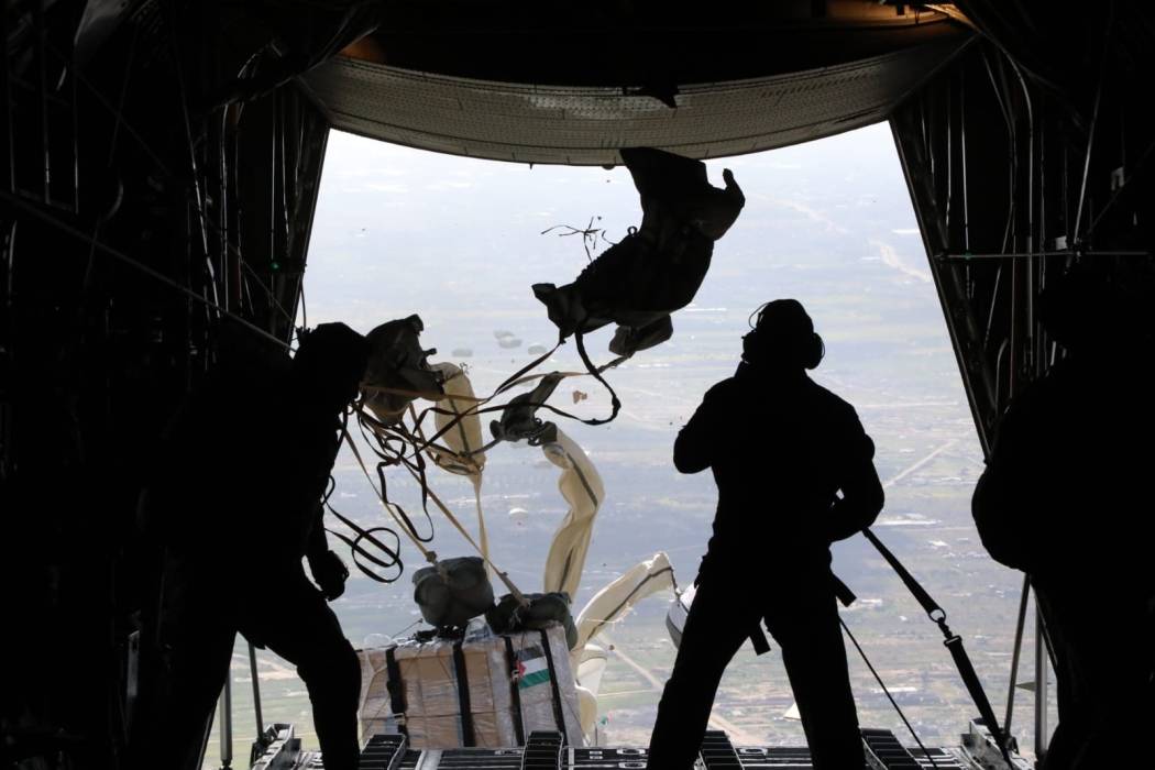 في إطار الجهود الدولية التي تبذلها المملكة الأردنية الهاشمية للتخفيف من آثار الحرب الدامية على قطاع غزة، نفّذت القوات المسلحة الأردنية الجيش العربي، اليوم الخميس وبتوجيهات ملكية سامية 9 إنزالات جوية بالاشتراك مع دول شقيقة وصديقة تستهدف عدداً من المواقع في شمال قطاع غزة، واشترك في تنفيذ العملية مع سلاح الجو الملكي طائرات تابعة لجمهورية مصر العربية الشقيقة والولايات المتحدة الأمريكية وجمهورية فرنسا ودولة هولندا وبلجيكا.