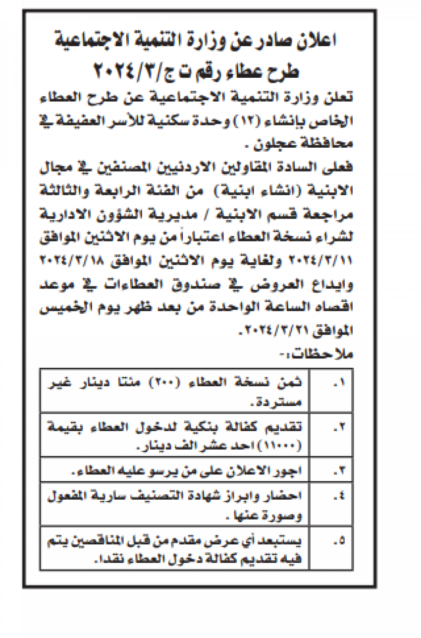 أعلنت وزارة التنمية الاجتماعية اليوم الثلاثاء، عن طرح عطاء لإنشاء 12 وحدة سكنية للأسر العفيفة في محافظة عجلون.