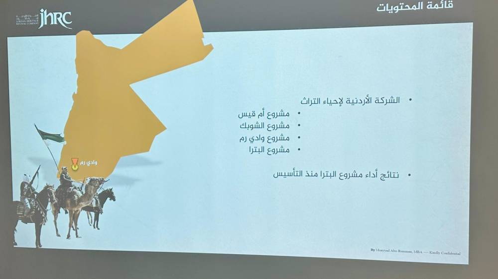 وقدم أبو رمان عرضاً حول مشاريع الشركة في مناطق المملكة مثل البترا والشوبك ووادي رم وأم قيس والتي توفر منتجاً سياحياً يحاكي الحضارات التي تعاقبت على الأردن حسب كل منطقة.