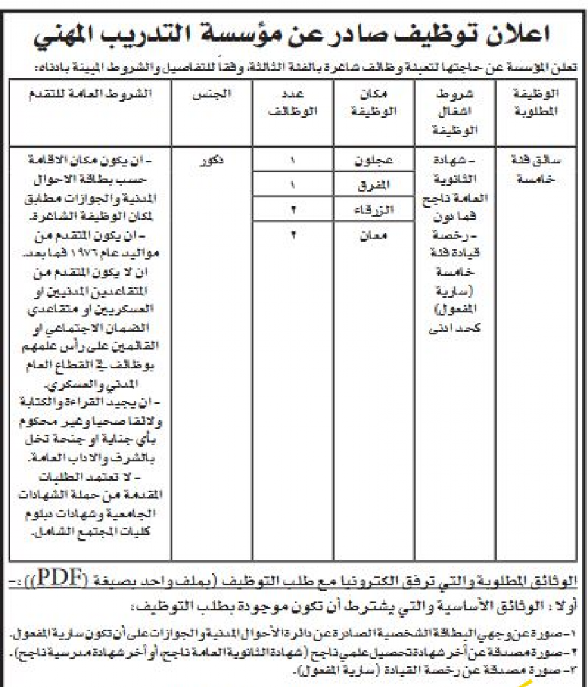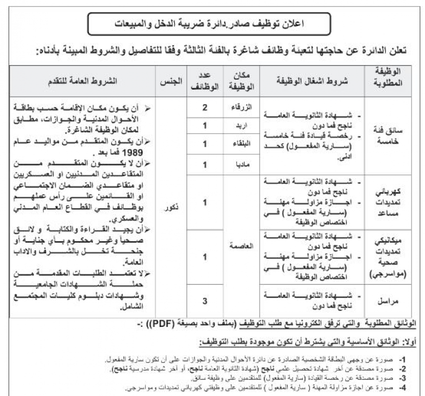 أعلنت مؤسسة التدريب المهني ودائرة ضريبة الدخل والمبيعات اليوم الخميس عن حاجتها لتعبئة وظائف شاغرة بالفئة الثالثة، وفقا للتفاصيل والشروط التالية: