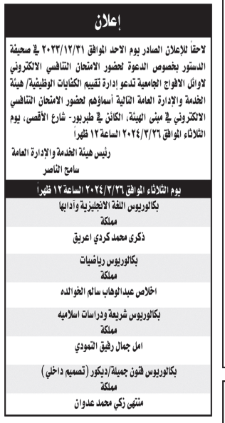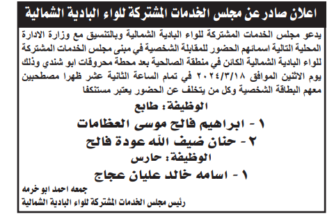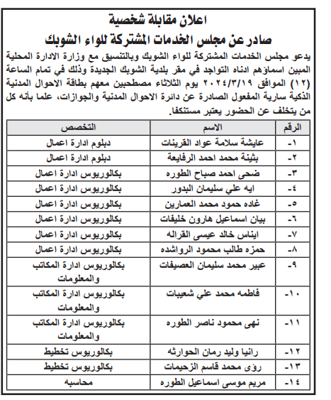 دعت وزارات ومؤسسات حكومية، اسماء مرشحين لإجراء مقابلات شخصية لغايات استكمال اجراءات التعيين.