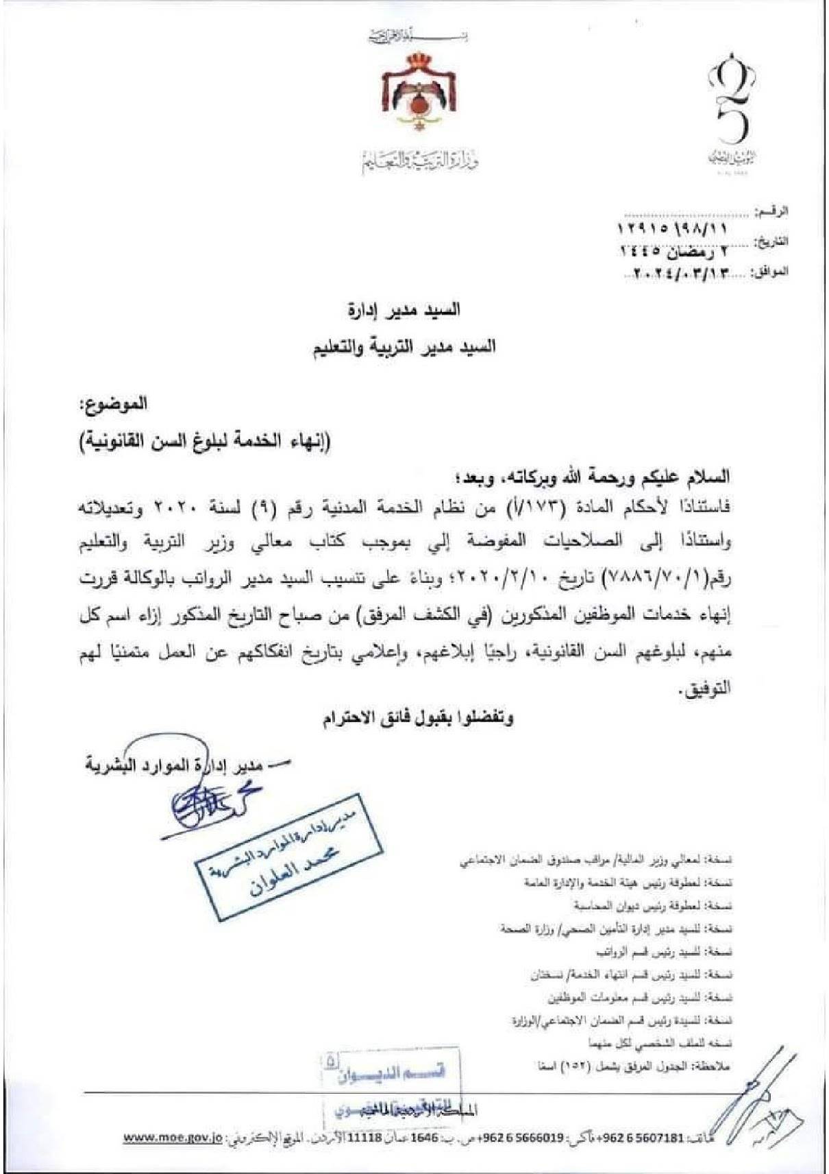 قررت وزارة التربية والتعليم إنهاء خدمات 152 موظفا لبلوغهم السن القانونية.