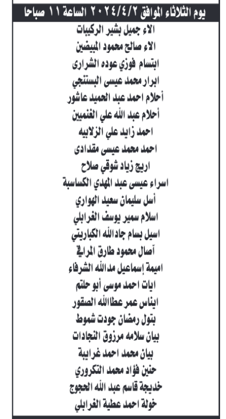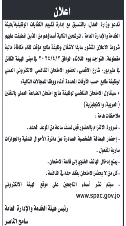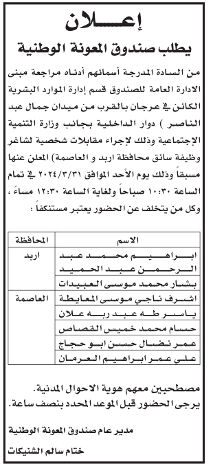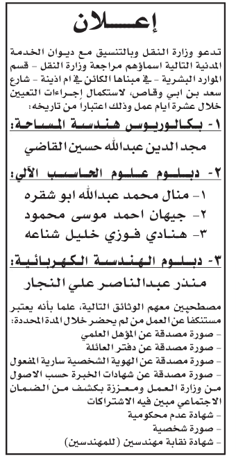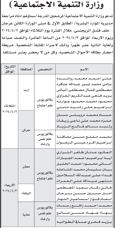 دعت عدد من المؤسسات الرسمية مرشحين لإجراء المقابلات الشخصية وتقديم الامتحان التنافسي واستكمال إجراءات التعيين.