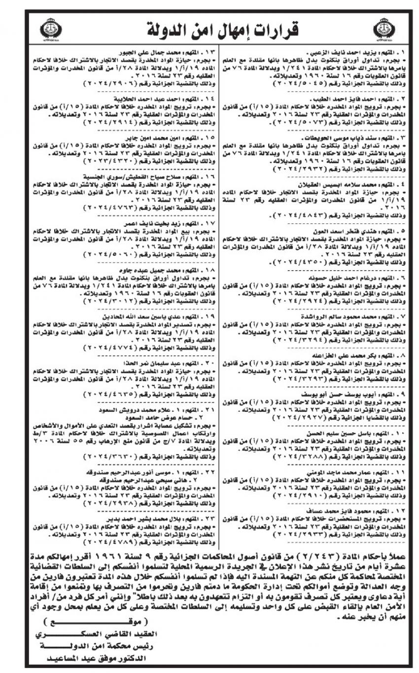 وطلبت المحكمة من أفراد الأمن العام إلقاء القبض على كل واحد منهم وتسليمه إلى السلطات المختصة، داعية كل من يعلم بمحل وجودهم التبليغ عنهم.