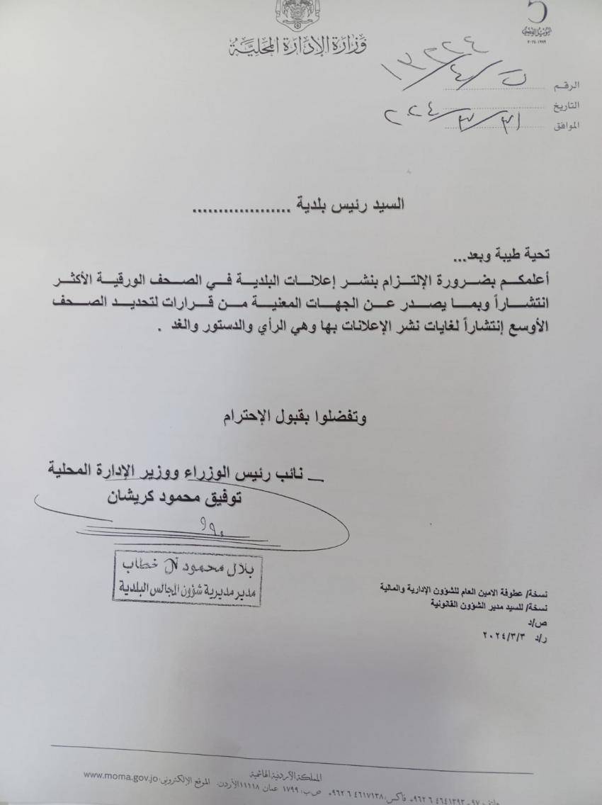 ووجه كريشان كتابا إلى رؤساء البلديات حدد الصحف الاكثر لغايات نشر الإعلانات فيها وهي الرأي والدستور والغد.