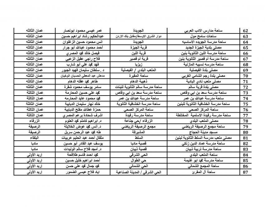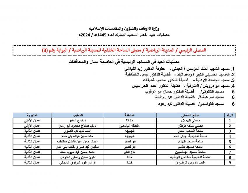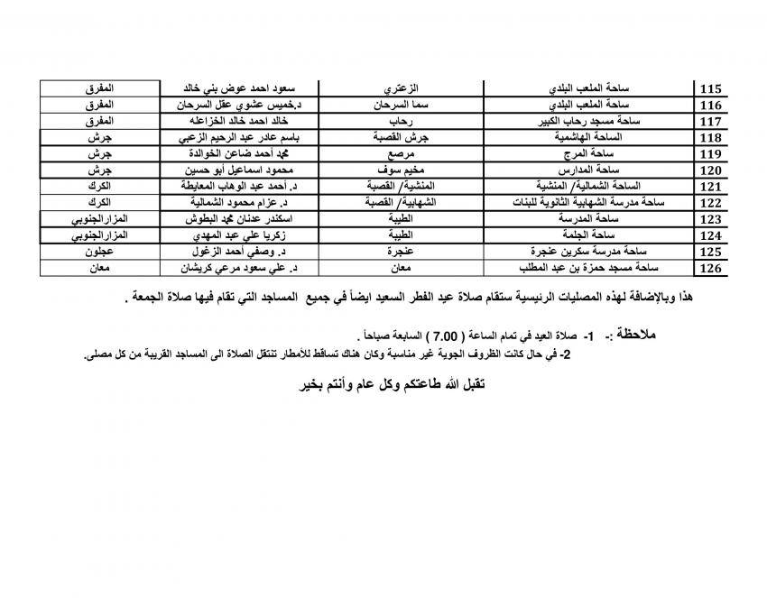 وقال الناطق الاعلامي باسم وزارة الأوقاف والشؤون والمقدسات الإسلامية الدكتور علي الدقامسة ان صلاة العيد ستقام في المصليات والمساجد التي اعلنت عنها الوزارة عبر موقعها الإلكتروني، مشيراً الى انه في حالة هطول الأمطار ستقام الصلاة بالمساجد التي تقام بها خطبة الجمعة.