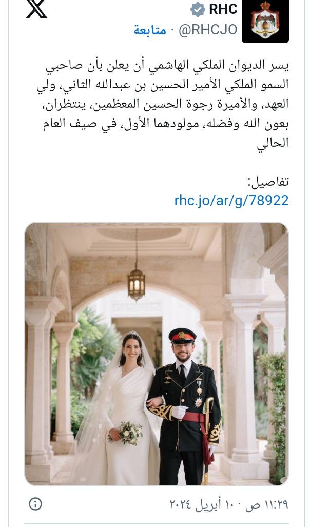 أعلن الديوان الملكي الهاشمي  أن  صاحبي السمو الملكي الأمير الحسين بن عبدالله الثاني، ولي العهد، والأميرة رجوة الحسين المعظمين، ينتظران، بعون الله وفضله، مولودهما الأول، في صيف العام الحالي.