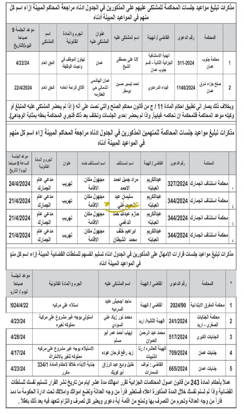 وفي مذكرات أخرى، طالبت محاكم متهمين مراجعة المحاكم المبينة إزاء اسم كل منهم في المواعيد المبينة.