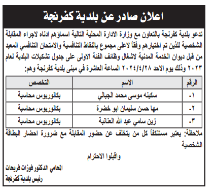 دعت مؤسسات رسمية عدة، اليوم الأحد، مرشحين لحضور المقابلات الشخصية ولاستكمال إجراءات التعيين.